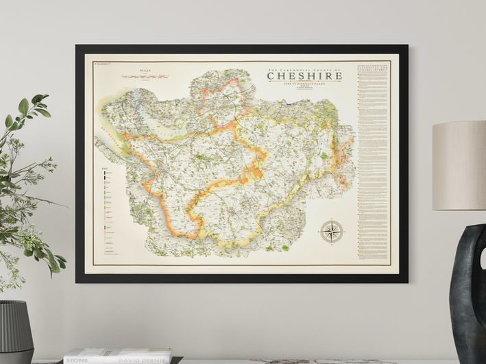 The hill shading applied to the map brings the topography alive showcasing the difference between the mountainous landscape in the east around the Peak District to the vast Cheshire Plain across the interior of the county.