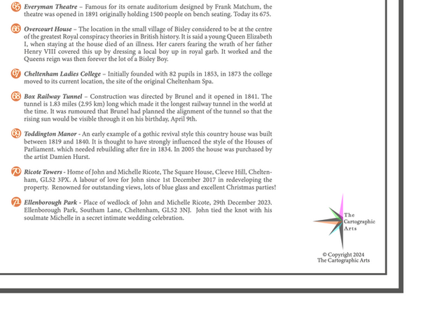 dates, names and titles of an event are usually added sympathetically around the title of the map. a personal message is typically added somewhere separately